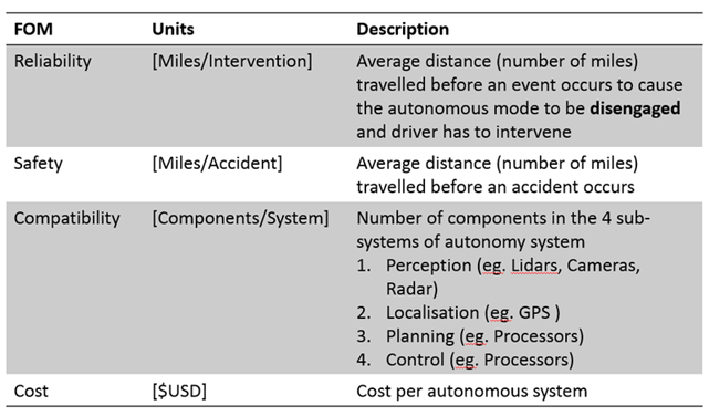 Four main figures of merit, in terms of reliability, safety, compatibility, and cost are used to quantify the performance and utility level of the autonomous system for ground transport.