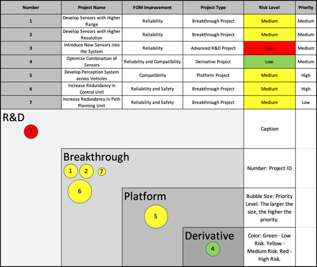 According to our technical and financial models, several goals and milestones emerged for the future development trend regarding the autonomous system for ground transport. These development opportunities go along with the figures of merit discussed above and thus can be further materialized into various projects. Below is a list of the potential projects and their respective categorization, along with their individual risk level and priority. The level of priority is evaluated based on how soon the technology is required along the development timeline as well as the relative maturity level. That is to say, a relatively matured technology (less development work required to realize it) which is needed the soonest, will be of high priority. The level of risk is evaluated based on the level of disruptiveness the project would bring to the current technology.