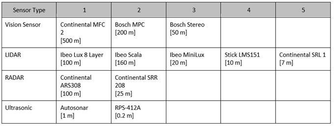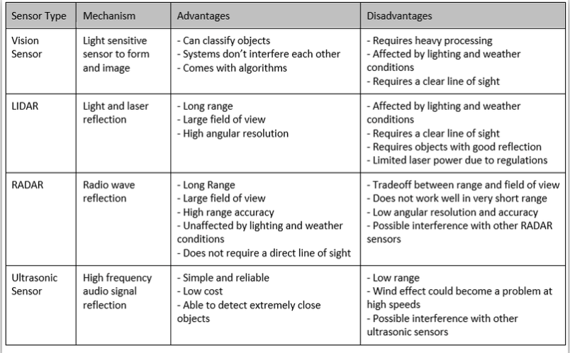 This technology roadmap concentrates on different types of sensors, which are the most significant enabling components, employed in the perception system. Four most common types of sensors and their respective properties are listed in the table below.
