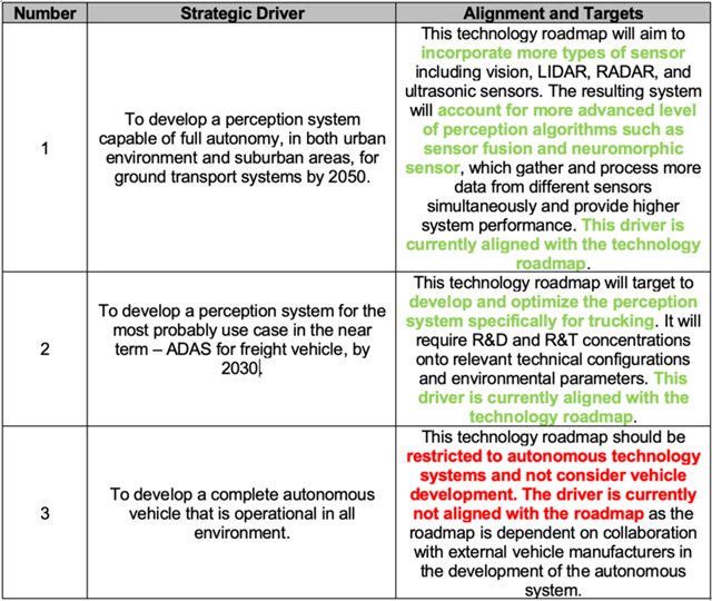 The table below shows the potential strategic drivers and their respective alignment with the perception system for autonomous system for ground transport technology roadmap.