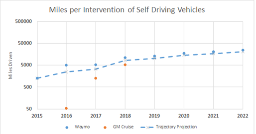 The performance data were extracted from the disengagement report from Californa's Department of Motor Vehicles. The data here were reported by the indicated companies from their testing of autonomous vehicles in a bounded test environment of public roads in California. [ref https://thelastdriverlicenseholder.com/2019/02/13/update-disengagement-reports-2018-final-results/]