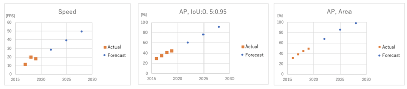 The diagram given below shows the accuracy and speed of the models based on the above results. Targets depend on application requirements. Some applications would require high speed and accuracy, and others might satisfy high speed and middle-level accuracy. As an example, higher accuracy and speed target is plotted on the chart. If a company wants to release an application that requires more than the target point within 2025, the company should decide to invest the technology improvements to achieve the goal. In a case where it should be released by 2030, the company may want to wait for the models to be improved on their own without investments. However, these improvements are so fast that the forecast should be revised regularly and short-term. However, new models for object detection are proposed every year. Therefore, it is not always a good strategy to invest in R&T for the development of a specific model. Instead, it would be good to invest human resources who can conduct to examine these rapid technology improvements and accommodate them to applications that will be made for a specific purpose by companies. Actually, M2Det was said to be good at the beginning of 2019, but Cascade Mask R-CNN (Triple-ResNeXt152, multi-scale) seems to attract attention more in the second half of 2019. Also, the limits of technological improvement should be observed.