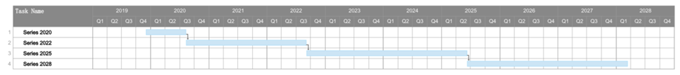 The Figure of Merit (FOM) was organized into two main categories, Machine learning and Augmented reality. We established the long-term targets of the ideal product values. The current technology isn't ready to achieve the target levels, are a result of this we organized our Product Roadmap into 4 main products: Series 2020, 2022 and 2025 and 2028. The FOM's values were based on the linear approximations of the models up to 2028. The green highlighted cells are in the year the product achieve the Target.