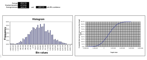 Doing a Monte Carlo simulation for 2000 runs, to test the uncertainty of the demand using a random generator with a uniform distribution, and 20% uncertainty, it yields an average ~$500k, with a high standard deviation (a lot of variability), and a 95% confidence that the NPV will be between $492k and $557k.