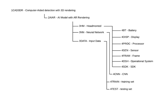 3HM head-mounted components, 3NN Neural Network algorithms, and 3DATA. In turn, these require enabling technologies at level 4, the technology component level: 4CNN as the level of layer used for the neural network algorithm, 4TRAIN which is the data set to train the model and 4TEST for testing it.