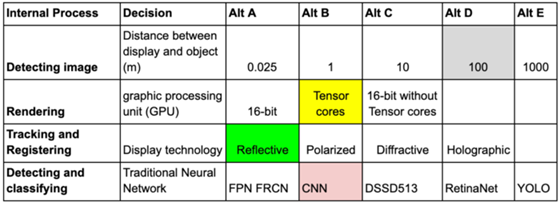 The list of drivers shows that the company views integrated AR/AI software as a potential new business and wants to develop it as a commercially viable (for profit) business. The roadmap focuses on the B2B segment, not consumers. In order to do so, the technology roadmap performs the analysis using a set of FOM targets that state that IoU needs to achieve an accuracy in object detection of ~95% (although it also depends on the industrial application, lower accuracy can be accepted), a resolution of 60ddp, latency of 20ms, and close to 60fps.
