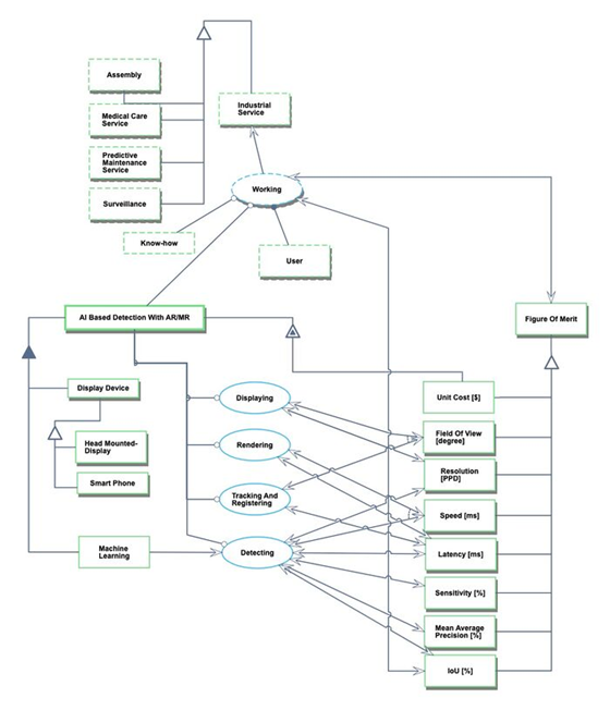 We provide an Object-Process-Diagram (OPD) of the 2AIAR roadmap in the figure below. This diagram captures the main object of the roadmap (AI and AR), its decomposition into subsystems (i.e. display devices such as head-mounted and smartphones, algorithms and models), its characterization by Figures of Merit (FOMs) as well as the main processes (Displaying, Tracking and Registering, Detecting, Rendering). Industrial services using this technology may include assembly work, medical care, surveillance, and preventive maintenance, but these are outside of the system boundary in this OPD. Here, the user is the agent of each application, not the direct agent of the technology.