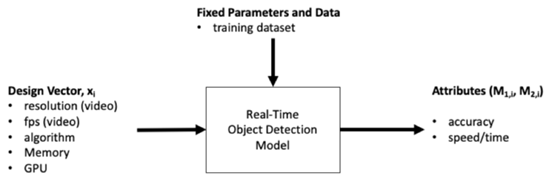 To build a Tradespace for real-time object detection model, we are using the design vectors, fixed parameters, and attributes as presented in the chart below.