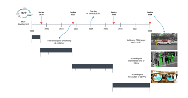 Our target is to develop technology that creates AI-based content for augmented reality leveraging the most advanced machine learning models to solve complex business, industrial, and societal problems. This technology advances augmented reality to the point of real time capturing of object/image, at the highest quality, with instantaneous object detection through a trained machine learning algorithm. To achieve this, our company will focus in a series of projects to maximized accuracy of detection and speed, specifically to be interfaced and rendered to AR devices. Our target is to obtain a ~60fbs (measure of speed), and for the CNN (ML) models a mAP (mean Average Precision) of 95% for an IoU (Intersection over Union) range between 0.5 and 0.95, and taking into account latency (~20ms). These projects should be developed in the next 3 years with final testing and prototyping at a customer site starting in 2023 to go into service in 2024. Both could be developed in partnership with companies like Google, PTC, or others. This is based on a seamless interface between both technologies to be rendered through most AR devices available in the market with a spec equivalent to a 4-Core NVIDIA Titan X today 12 years from now. Business targets are expected to be met by ~2030.