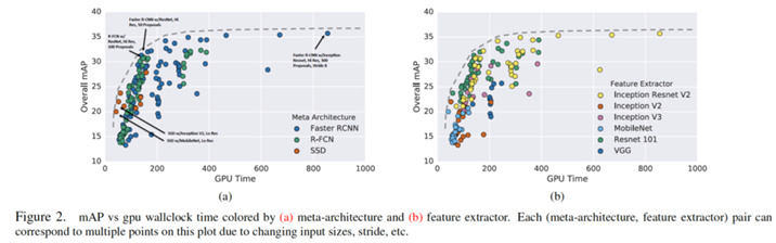 This paper aims to serve as a guide for selecting a detection architecture that achieves the right speed/memory/accuracy balance for a given application and platform. To this end, the authors investigate various ways to trade accuracy for speed and memory usage in modern convolutional object detection systems. Some successful systems have been proposed in recent years. Still, apples-to-apples comparisons are difficult due to different base feature extractors (e.g., VGG, Residual Networks), different default image resolutions, as well as various hardware and software platforms. This paper presents a unified implementation of Faster R-CNN, R-FCN, and SSD systems, which is viewed as “meta-architectures.” It traces out the speed/accuracy trade-off curve created by using alternative feature extractors and varying other critical parameters such as image size within each of these meta-architectures.