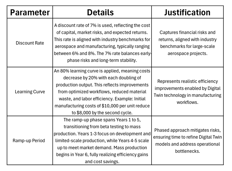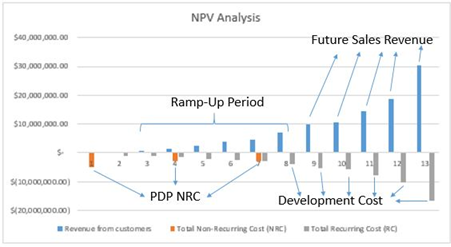 The figure below shows the non-recurring cost (NRC) of the product development project (PDP), which includes the R&D expenditures (not presented as a sunk cost - which is typical in financial analysis). A ramp up-period of immediate revenue with just 1 customer for year 2, a linear growth for the first 7 revenue years, and then from period 8 until 12, the growth has a more exponential behavior, as it is typical for this type of technology in the B2B segment. The R&D project will focus on the first 12 periods, with a more R&T project during the first 7 years, and a more R&D for the later periods as it will switch to incremental improvements of a more matured technology with other competitors in the market.