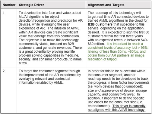 The roadmap confirms that it is aligned with this driver. This means that the analysis, technology targets, and R&D projects contained in the roadmap support the strategic ambition stated by driver 1. The second driver, however, which is to use this AI/AR technology for consumers or domestic applications, is not currently aligned with the roadmap. Our hypothesis is that for the consumer, the evolution of the form factor for the AR device plays a key role and another roadmap needs to be created.