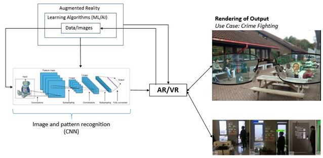 Speed and resolution are key to the success of this interface. For example, and presenting a use case for crime-fighting, as the image above shows: an image is captured through the AR device, processed and detected with a CNN architecture, with the results to be rendered back into the AR device for immediate action. In this case, a most wanted criminal has been detected as a police unit passes through an area of the city.