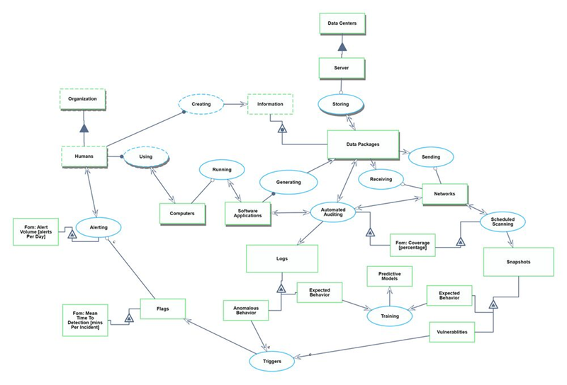 We defined a Continuous Security Monitoring (CSM) tool to sit within the environment of an organization's Information Technology (IT) infrastructure. The system contains the IT landscape at a high level, such as software applications, data infrastructure, and network routing. We narrowed to just the monitoring and alerting functionality of a CSM tool. There could be additional functionalities within data security such as root cause analysis, remediation, and pro-active repairs, but we have excluded those from our system.