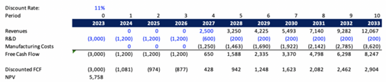 Discounting the future cash flows at a discount rate of 11% yields a NPV of $5,758k. This also takes into consideration initial R&D investments of $3,000k in period 0 (2023).