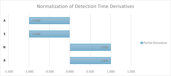 Of the variables in MTTD, only Incident Detect Time (also called Detection Time) is within a tooling’s control. The Number of Incidents and Incident Start Time is more often determined by external factors. For a baseline design, say we have an Incident that starts on one of our endpoints. Our tool scans every 30 minutes (R). Each scan has 600 network events (N). The efficiency (E) of data processing is the ability of the tool to quickly analyze those total network events to only the relevant ones. Efficiency is rated on a scale of 1-10 where 1 is the least efficient such as a human manually reviewing the network events for processing and 10 is the most efficient using a supercomputer for data processing. Our baseline design has an efficiency coefficient of 6, which equates to a modern cloud processing engine but it is not fully optimized. Accuracy (A) is the measurement of how likely the identified relevant events are true security incidents vs false negatives or false positives. Our baseline design has an 80% accuracy. For the baseline design, what is the likely time passed from incident start until detection (IDetect)? 62.5 minutes per event. Changes in the parameters and their effect on Detection Time is below.
