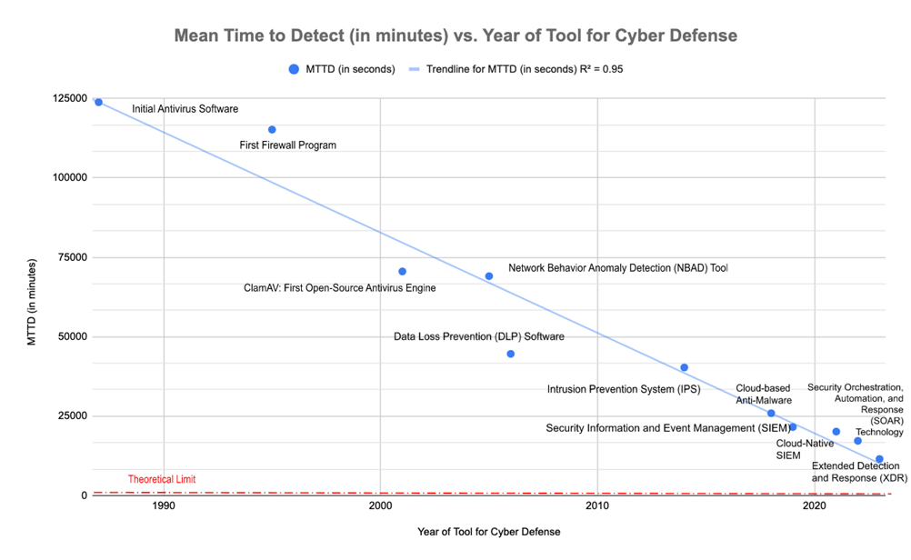 The FOM for Mean Time to Detect (MTTD) is plotted below as the evolution of the technology has afforded a decreased value for MTTD, approaching the theoretical limit of zero, or instantaneous detection. However, reaching an absolute zero MTTD may not be possible due to constraints such as processing time, network latency, and inherent limitation in detection algorithms. The sensitive nature of cybersecurity makes publicly available data a challenge, as well as data sharing. The novelty of the technology in the cybersecurity domain also contributes to the dearth of data and lack of historical data for the technology. Therefore, 13 - 22 of the the resources listed in References informed the construction of the graph below.