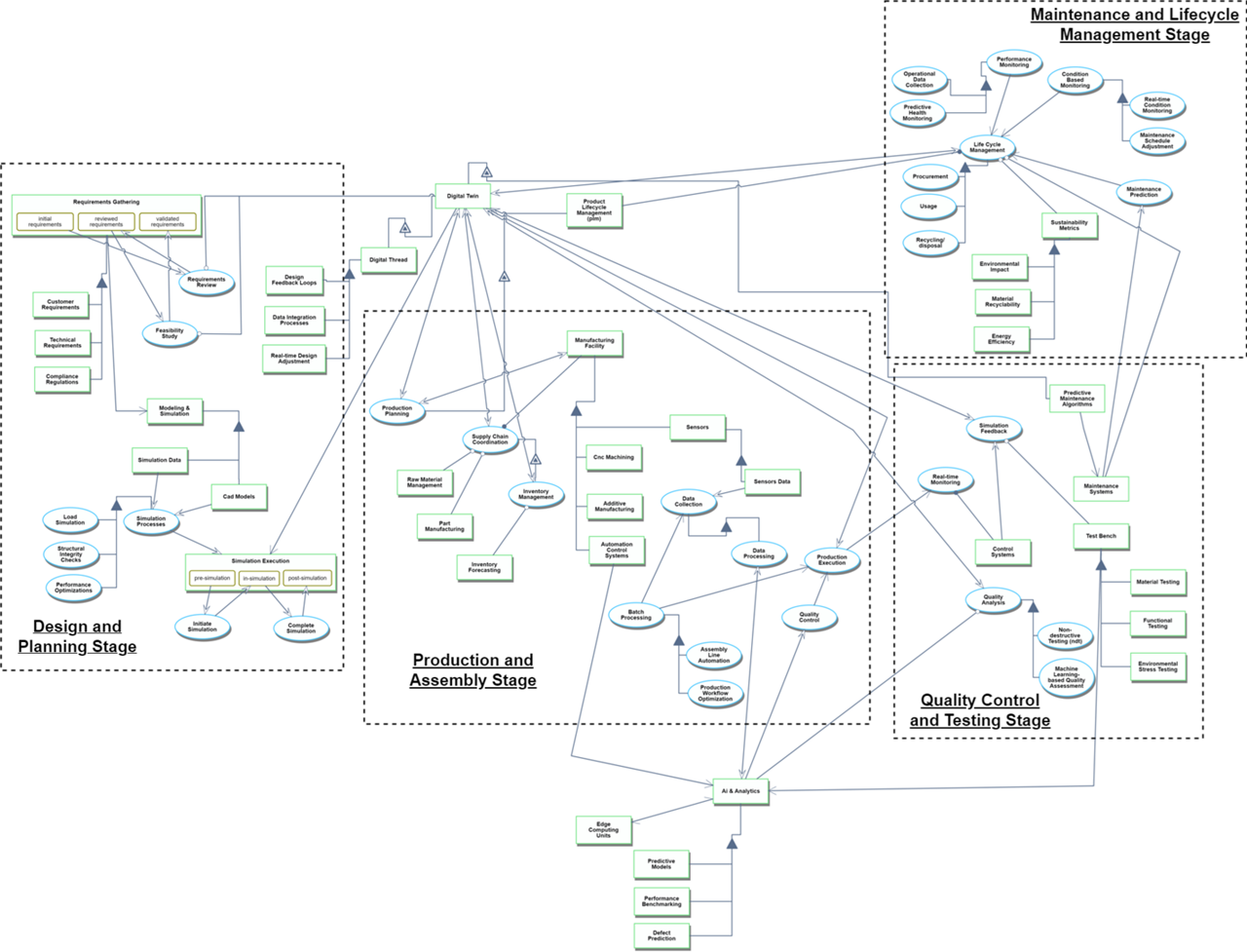 The Digital Twin roadmap outlines a comprehensive flow across multiple lifecycle stages, incorporating the design and planning, production and assembly, quality control and testing, and maintenance and lifecycle management stages. At the core is the Digital Twin, which integrates data from sensors and real-time monitoring systems to simulate, optimize, and adjust virtual models of aircraft products, manufacturing facilities, and operational systems. Through the Digital Thread, a continuous feedback loop is maintained, connecting the aircraft's design, production, and operational performance. The roadmap includes processes such as Data Collection, Simulation Execution, Predictive Maintenance, Quality Control, and Lifecycle Monitoring, ensuring that the digital and physical realms are synchronized for efficient production, real-time operational adjustments, and sustainable lifecycle management. Advanced AI Analytics and Predictive Algorithms enhance the system's ability to monitor and predict outcomes, while interdependencies between the Supply Chain, Manufacturing Process, and Product Design are continuously optimized for enhanced productivity, scalability, and environmental sustainability. This approach ensures a seamless integration of all stages, enabling precise decision-making and high operational efficiency.