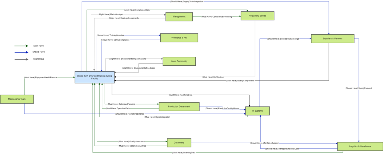 We began by identifying key stakeholders who have a direct or indirect impact on the Digital Twin system, as well as those who rely on its performance. This included departments such as production, logistics, IT systems, management, regulatory bodies, customers, and the workforce. For each stakeholder, we conducted a thorough needs analysis to determine their core requirements. For instance, the production department required high efficiency and cost control, while the workforce and HR emphasized safety and productivity improvements. This stakeholder mapping helped us clarify both the fundamental and aspirational goals of each group, ensuring that the Digital Twin technology aligns with their expectations.