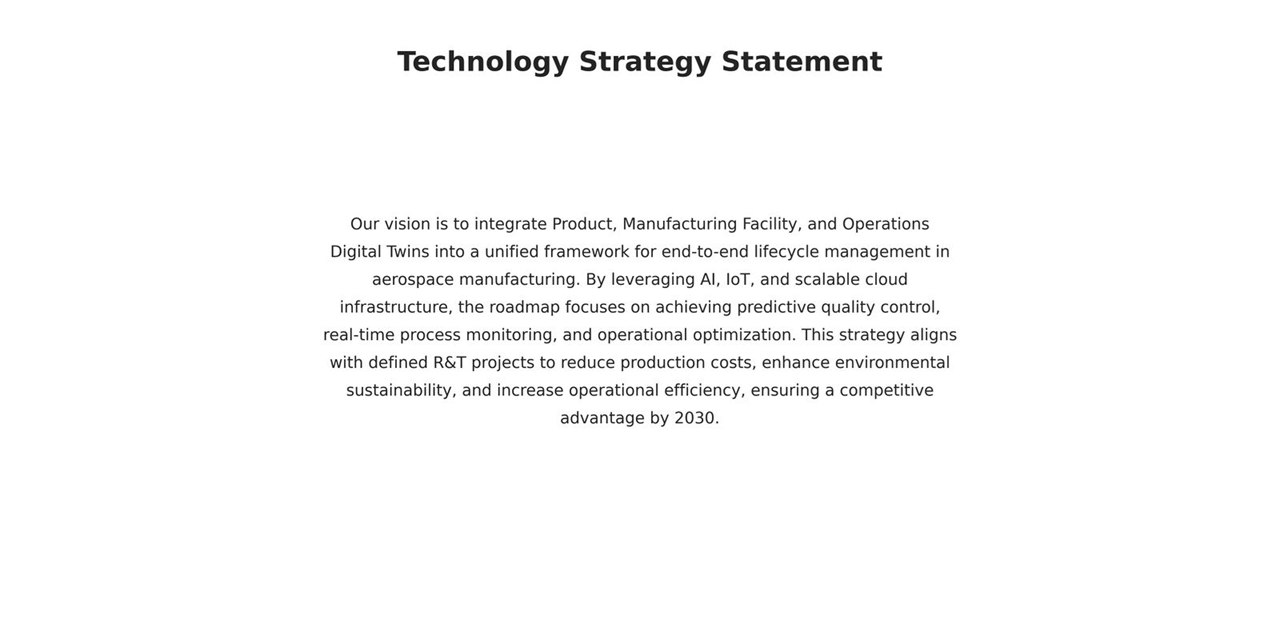 A technology roadmap should conclude and be summarized by both a written statement that encapsulates the technology strategy emerging from the roadmap and a graphic that illustrates the key R&D investments, milestones, and vision for this technology over time. For the 2DTT - Digital Twin Technology roadmap, the strategy statement can be outlined as follows: