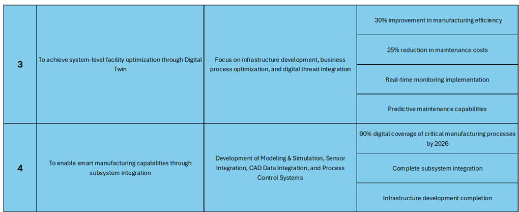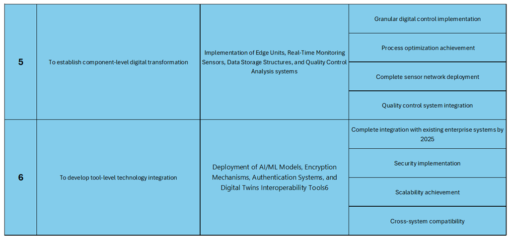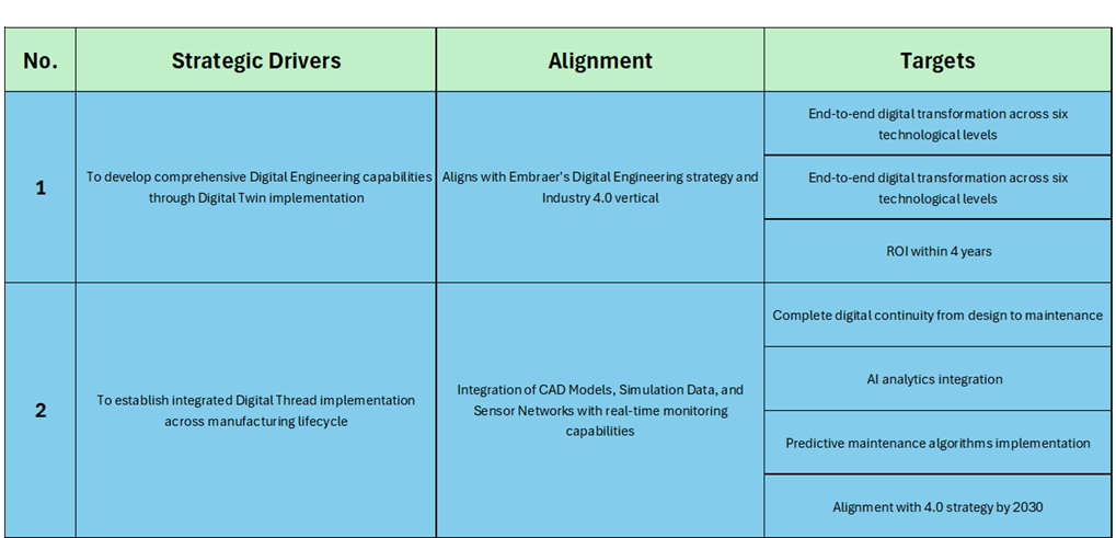 The table illustrates the strategic alignment of Embraer's Digital Twin implementation with key objectives. The first strategic driver focuses on developing Digital Engineering capabilities, aligning with Embraer’s Digital Engineering strategy and Industry 4.0 goals. The targets include achieving end-to-end digital transformation across six technological levels and realizing ROI within four years. The second driver emphasizes the establishment of an integrated Digital Thread across the manufacturing lifecycle, aligning through CAD models, simulation data, and real-time monitoring capabilities. This driver aims to achieve digital continuity from design to maintenance, AI analytics integration, and predictive maintenance by 2030. The third driver targets system-level optimization through infrastructure enhancement and business process improvements, aiming for a 30% efficiency increase, 25% cost reduction in maintenance, and real-time monitoring. The fourth driver supports smart manufacturing through subsystem integration, targeting 90% digital coverage of critical processes by 2026. The fifth driver focuses on component-level digital transformation, aiming for granular digital control, process optimization, and complete sensor network deployment. Lastly, the sixth driver aims to integrate AI/ML models, encryption, and interoperability tools at the tool level, targeting enterprise-wide integration, security, scalability, and cross-system compatibility by 2025.
