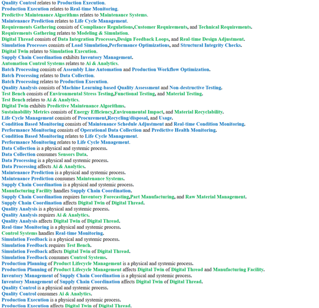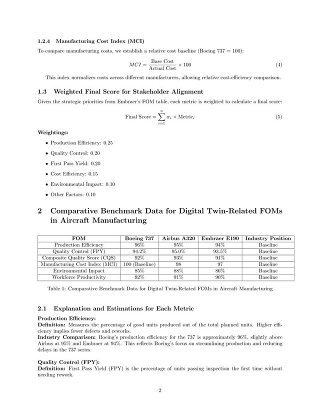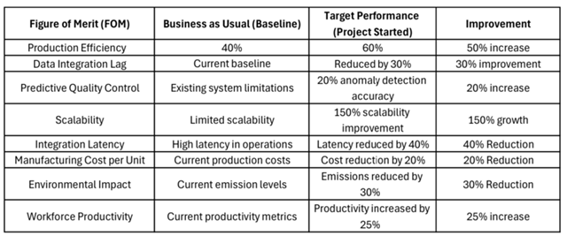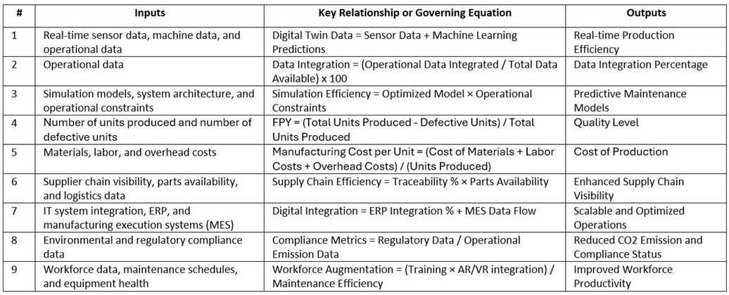 After defining the FOMs, we focused on developing the key governing equations that could quantify each metric. These equations helped us translate stakeholder needs into mathematical formulas that could be tracked and optimized in the Digital Twin system. For example, Production Efficiency was calculated using real-time sensor data, machine learning predictions, and operational output data. First Pass Yield (FPY) was derived from the total number of units produced versus defective units, reflecting quality control measures. Each governing equation ensured that our FOMs were not only measurable but also provided actionable insights into system performance, enabling continuous optimization and alignment with stakeholder needs.