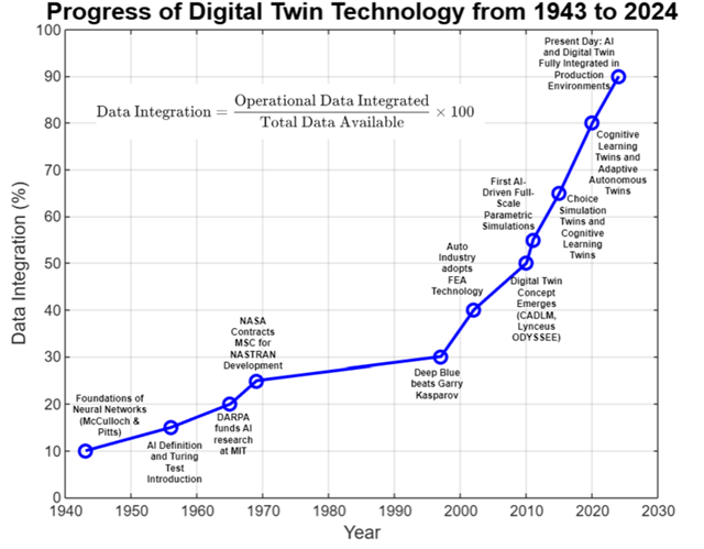 The diagram Progress of Digital Twin Technology from 1943 to 2024 illustrates how Digital Twin has evolved over the years regarding its capability to integrate available data for specific complex systems. Historical events have been used as Data points to illustrate the critical milestones in Ditial Twin, incorporating technologies such as Neural Networks, Computer Aided Engineering (CAE), Computer-Aided Design (CAD), and Cognitive Learning capabilities. The evolution graph uses Data Integration Equation to track the progression of capability development of Digital Twin, with each historical milestone appearing to mark an increase in data integration.