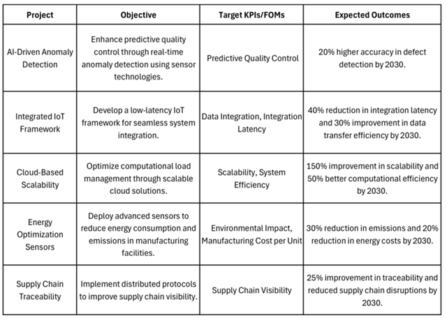 Where: - 𝑦₁, 𝑦₂, …, 𝑦ₘ represent **Product-specific FOMs**, such as Production Efficiency, Data Integration, Scalability, and Environmental Impact. - 𝑥₁, 𝑥₂, …, 𝑥ₙ represent **Technology FOMs**, such as AI & ML Processing Accuracy, IoT Connectivity, Cloud Scalability, and Sensor Sensitivity.