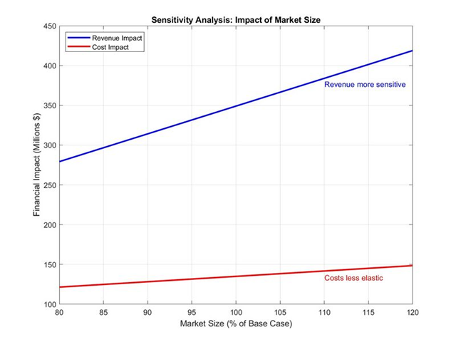 Revenue Sensitivity: Revenue is highly responsive to market size changes, growing significantly with an increase in market share, while costs remain relatively stable, demonstrating scalability.