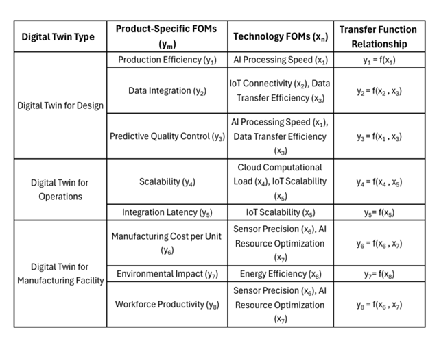 The Transfer Function Model provides a structured relationship between project-specific Figures of Merit (FOMs) and the enabling technology FOMs, enabling a quantitative assessment of how R&T efforts impact Digital Twin performance. This model is represented as: