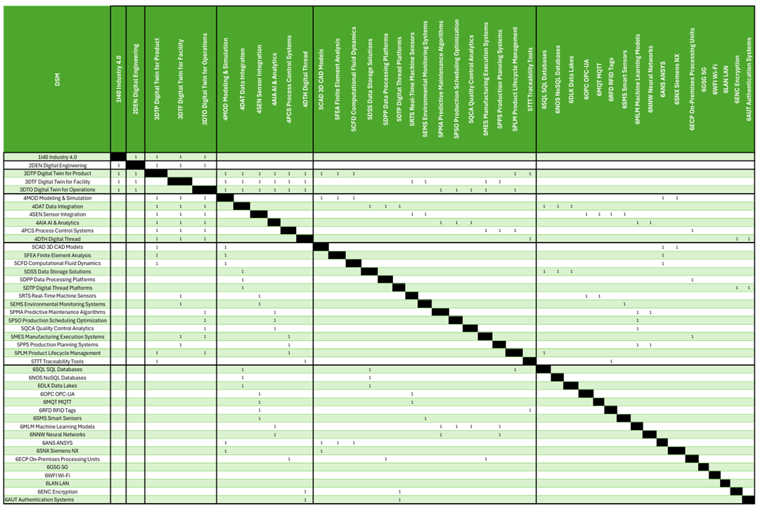 The above 2DTT Digital Twin Technology decomposition and Design Structure Matrix (DSM) visualize the complex layers of technology integration essential for next-generation systems. Starting at 1I40 Industry 4.0, the framework trickles down through key enablers like 2DEN Digital Engineering and 3DTF Digital Twin for Facilities, connecting all the way to component-level technologies such as 4MOD Modeling & Simulation, 4SEN Sensor Integration, and 5PMA Predictive Maintenance Algorithms. These lower-level elements at levels 4 and 5 don't operate in silos, and their interdependencies within the DSM reveal a dynamic, real-time interplay that facilitates continuous system optimization. By illustrating the interaction between subsystems like 4PCS Process Control Systems and 5DPP Data Processing Platforms, the matrix demonstrates how each layer contributes to the holistic advancement of digital twins—from high-level frameworks to operational intelligence. As data integration reaches new heights, the DSM paves the way for intelligent, adaptive systems that drive scalability, efficiency, and innovation, establishing the Digital Twin as the linchpin of future industrial transformation.