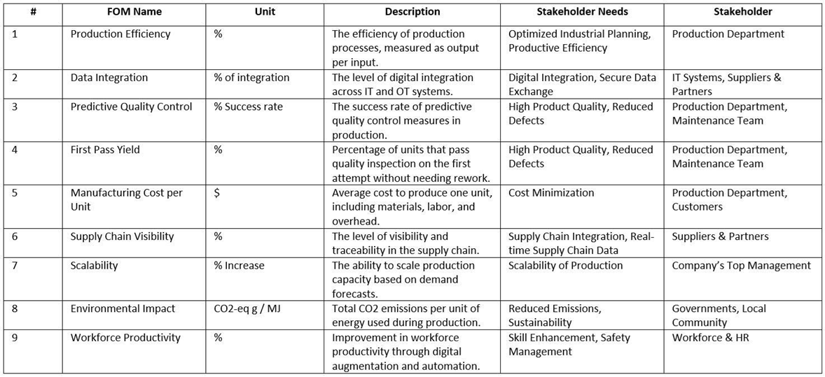 Using the stakeholder needs and goals derived from the SVN analysis, we developed a set of Figures of Merit (FOMs) to address these requirements quantitatively. Each FOM was designed to evaluate the performance of the system in a way that directly aligns with the needs of the stakeholders. For example, Production Efficiency was created to measure how well the manufacturing process optimizes output per input, directly addressing the production department's need for cost-effective operations. Similarly, Supply Chain Visibility measured how well the system tracks parts and inventory throughout the production process, aligning with logistics and warehouse goals. These FOMs ensured that every stakeholder's critical needs were measurable and improvable within the Digital Twin framework.