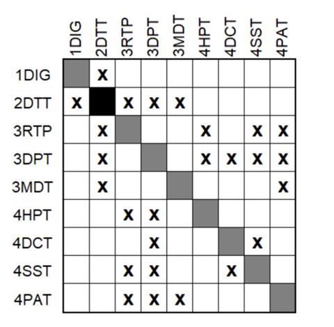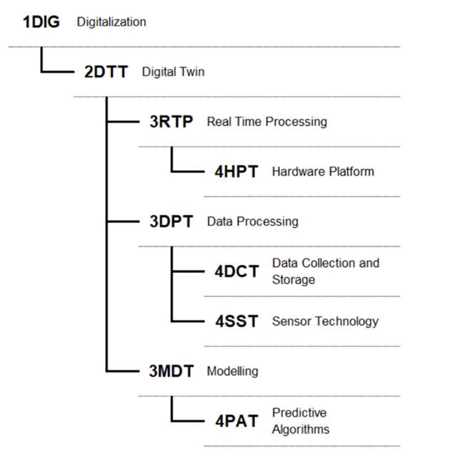 The dependencies between 2DTT are made explicit in the following Figure: Note that the sequence in which they are presented has been changed in order to keep higher-level technologies at the upper left quadrant of the DSM. It is worth highlighting the role of 3DPT as the most connected enabling technology in the DSM. The reason for this is the fundamental dependence of 2DTT on data acquisition. The sensor technology and the consequent storage of all the generated data play a key role in 2DTT reaching a higher level of performance. We will elaborate in subsequent sections.
