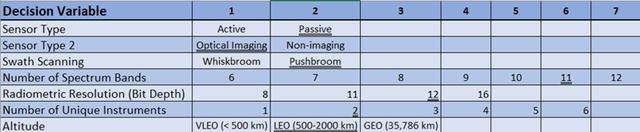 Our morphological matrix for an Earth Observation payload is shown below. Underlined values reflect those present on the Landsat 8 mission.