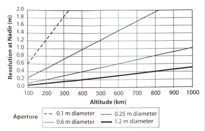 This spatial resolution relationship is also captured well by the following figure, reproduced from Space Mission Engineering: The New SMAD (Wertz et al. 2011). The heightened sensitivity to aperture diameter results in wide variations in the constant slopes of resolution vs. altitude (all lines are held at fixed wavelength in the visible spectrum).