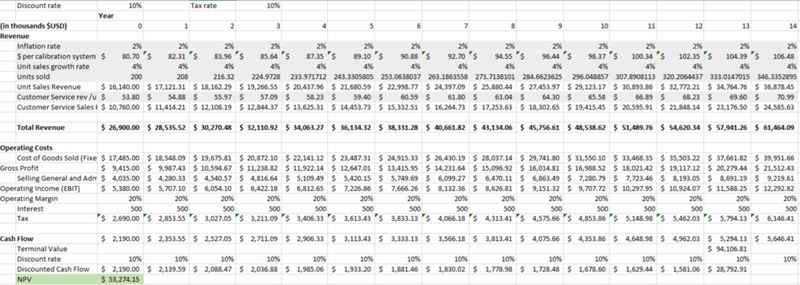 The primary take away from this activity is that the Labsphere business model continues to be profitable and have a positive net present value. It is important to note the uncertainty introduced into the model by the assumptions, such as the revenue breakdown and units sold. It is also important to highlight this model does not correct for any impacts of R&D that may currently be implicitly included in the 2018 estimated revenue and therefore the outcome of the model.