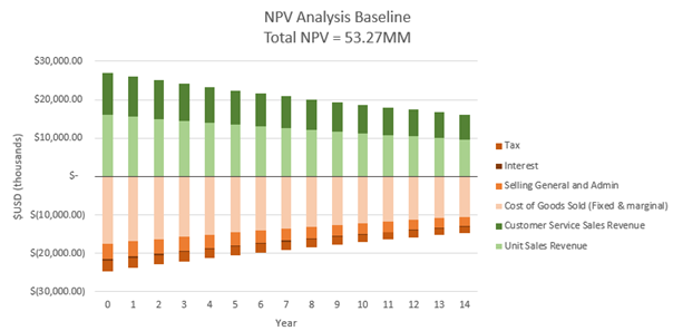 As is clear from the income statement above, the NPV of the baseline business model is $53.27 million USD. To better illustrate the drivers behind this NPV analysis, a discounted cash flow analysis for each year has been included below.
