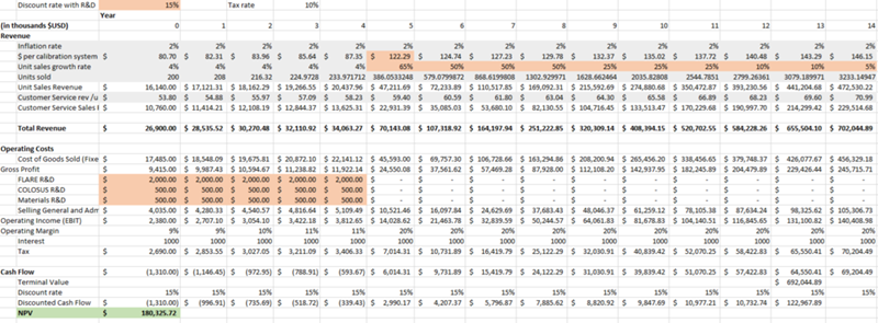 A Discounted Cash Flow and Net Present Value (NPV) Analysis was conducted for LabSphere incorporating R&D investments from their R&D investment portfolio. LabSphere's primary research investment is in the FLARE program which they have considerable industry interests in that they are working to convert to sales. This pro forma financial model is based on the baseline model above and the following assumptions: