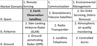 We have designated Earth Observation Satellites (2EOS) as a Level-2 Technology. It is present in the Level 1 Markets of 1) Low-Earth Orbital Technologies and Remote Sensing Technologies. For other examples of intersections on the basis of these markets, see the following figure: