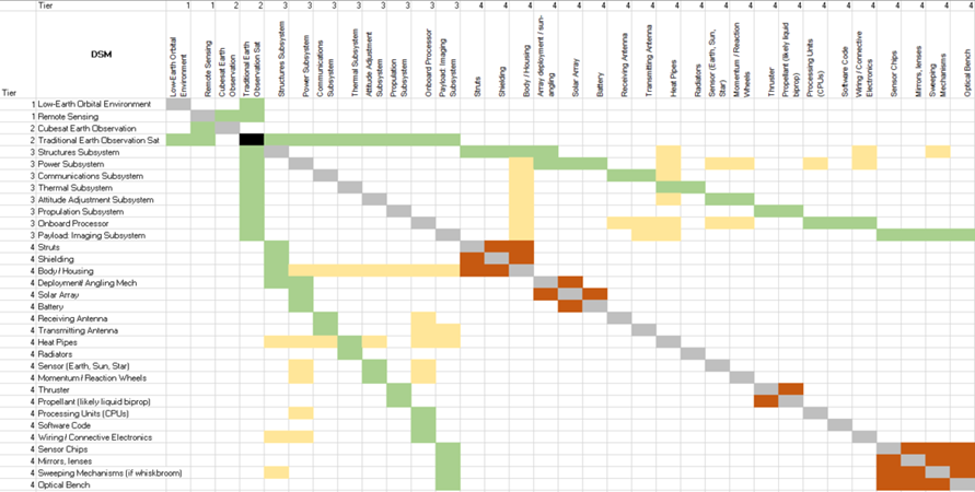 Orange: Physical interactions between Level four technologies within the same subsystem (solar arrays interact with any deployment and angling mechanisms)