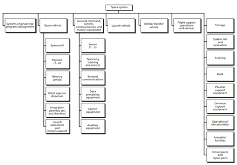 To begin, we have reproduced a diagram from the RAND Corporation showing the broader context of any space system, as a Level 1 technology, or perhaps even more appropriately, an entire Level 0 technological market domain. (Source: Bernard Fox, Kevin Brancato, Brien Alkire's 2008 "Guidelines and Metrics for Assessing Space System Cost Estimates") Many of the elements included here, such as launch vehicle and ground segment facilities are far outside of the scope of our analysis.