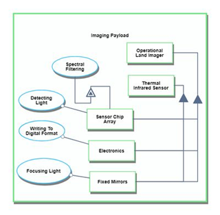 Next, we show another Level Zoom to examine components of the Imaging Subsystem in greater depth, using Landsat 8's imaging payload as an example. The subcomponents of the imaging subsystem, such as a sensor chip array, are highly specified Level 4 technologies.