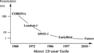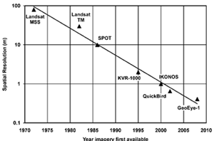 We will consider spatial resolution as principle among these, for most applications, including surveying, land management, urban planning, and disaster relief. Some hard tradeoffs exist between these. Generally, spatial resolution decreases with increasing spectral resolution; a minimum threshold of energy must reach the imaging sensor in order to resolve an image, and the smaller the band of electromagnetic radiation considered, the less power received. Wider accepted bands (panchromatic) have more difficulty discerning color, and thus discerning materials by their reflectivity, but they gain in spatial resolution. The following figures show estimations of the improvement in spatial resolution over time.