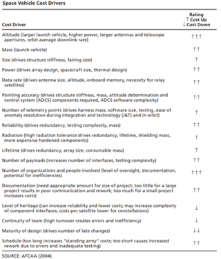 All four types of resolution are inversely associated with monetary cost; finer spatial, spectral temporal or radiometric resolution will all cost more to manufacture in an imaging sensor. We have been unable to pin down exact statistics on the effects of resolution on cost, e.g. estimation equations with coefficients and associated uncertainty, likely as a result of high mission-to-mission variability. While more specifics would be ideal, broadly, Fox et al. in a study published in affiliation with the RAND Corporation note that: "Cost-driving parameters for remote sensors include size, aperture, pointing accuracy, slew rate, number of detectors, operating temperature, resolution or sensitivity, and manufacturing yield." Relatedly, shown below are a set of wider cost trends for any space vehicle, produced by the Air Force Cost Analysis Agency, based primarily on the parameters of the subsystems shown in our Object-Process Diagram above. (See Bernard Fox, Kevin Brancato, Brien Alkire's 2008 "Guidelines and Metrics for Assessing Space System Cost Estimates" for more information)