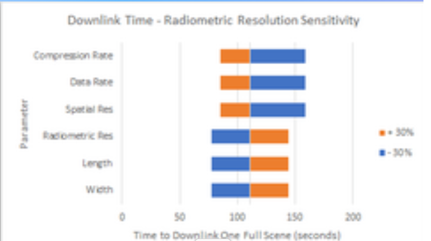 We consider first the relationship of minimum resolvable difference given by Rayleigh’s Resolution limit: X=h* / D (Wertz et al. Eq. 17-6) where X is our figure of merit, the spatial resolution, h is the satellite altitude, is the light wavelength, and D is the diameter of the lens aperture. The partial derivative of this system are quite simple to compute, namely:dX/dh = / D dX/d = h / D dX/dD = -h* / D2 Showing that slight changes to altitude and wavelength should result in constant changes in resolution (proportional to the ratio of the other two parameters), while changes in aperture diameter result in nonlinear effects on resolution. The tornado plot of the sensitivity of ground-range spatial resolution on these variables is as shown, based on figures for Landsat-8 with +/- 20% and +/- 30% changes: