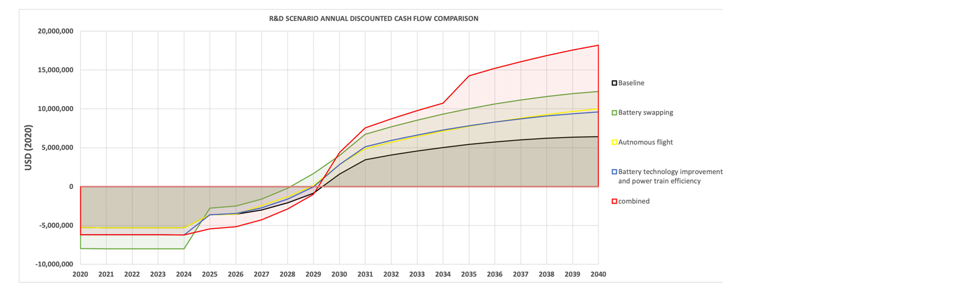 As is clear from the income statement above, the NPV of the baseline business model is $180.325 million USD, a considerable increase from the baseline NPV of $53 million. To better illustrate the drivers behind this NPV analysis, a discounted cash flow analysis for each year has been included below.