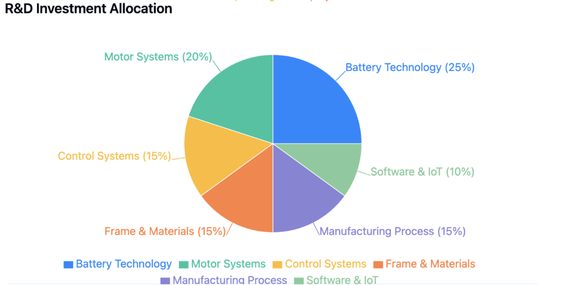 The R&D budget is strategically distributed across six key technology areas, with the largest allocations directed to battery technology (25%) and motor systems (20%), reflecting their critical importance in market competitiveness. The remaining budget is balanced across control systems, frame and materials development, and manufacturing process improvements (15% each), with 10% dedicated to software and IoT integration, creating a comprehensive innovation strategy. This allocation acknowledges battery and motor technology as primary differentiators while maintaining strategic investment in manufacturing efficiency, structural innovations, and digital capabilities, positioning manufacturers for sustainable competitive advantage in an evolving market.