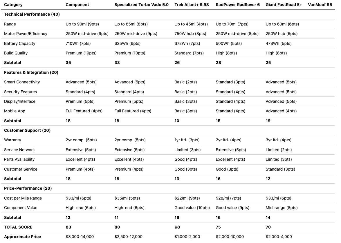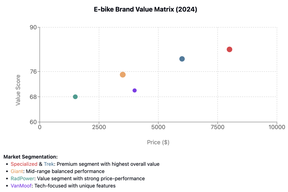 The e-bike market shows clear segmentation across price points and value propositions, with distinct tradeoffs between technical performance, features, support, and price. Key insights from the value comparison: