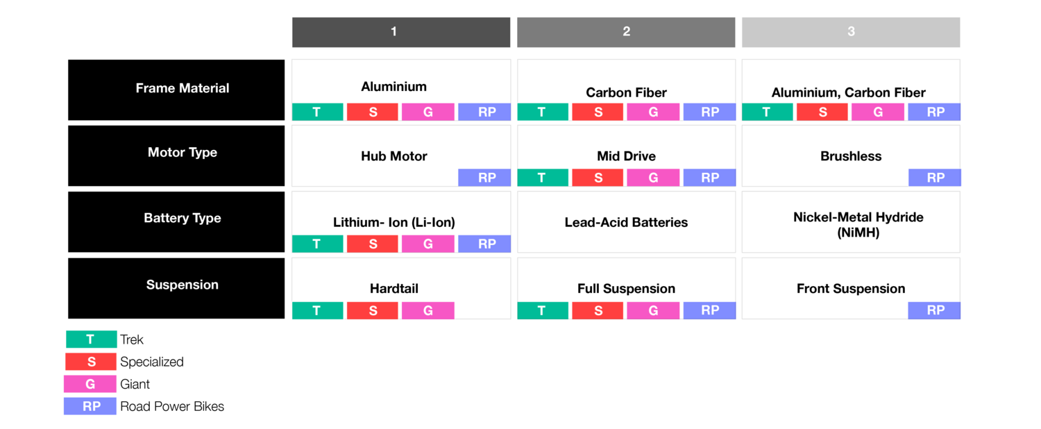 Below is a morphological matrix for leading e-bike manufacturers: Trek, Specialized, Giant, and Rad Power Bikes. This matrix outlines the different design choices each company makes across various components. A myriad of different component decisions must be considered when designing an e-bike. We chose the top four of the most important decision areas in the matrix below. For each, we listed three possible solution types under each component.