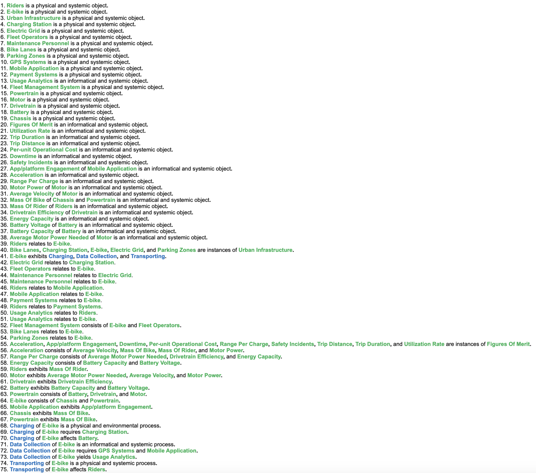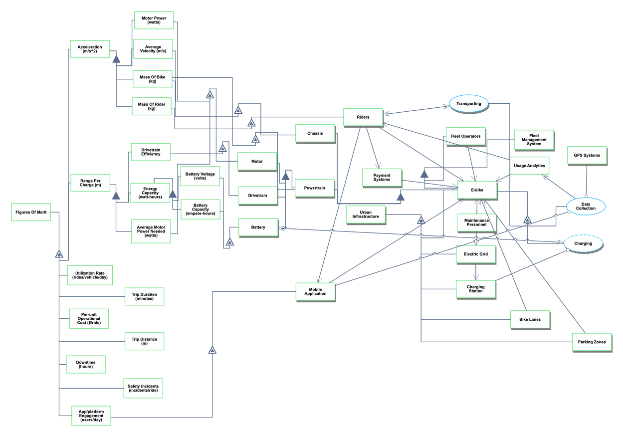 Below, we provide an object-process diagram (OPD) of the 2BKE roadmap. This diagram captures the main object of the roadmap, its decomposition into subsystems (powertrain, connectivity, structural, etc.), its characterization by Figures of Merit (FOMs), as well as the main processes and actors involved.